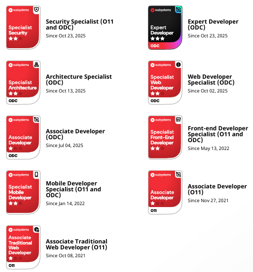 私はOutSystemsの開発エンジニアで、実務での開発・導入・最適化において4年以上の経験があります。保有資格については右側の画像をご参照ください。
